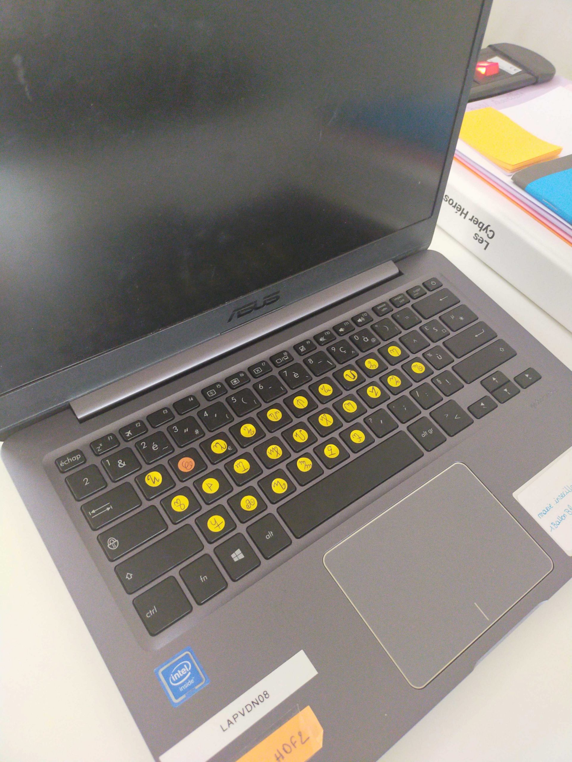 Il faut maintenant préparer l’épreuve finale : Changer le mot de passe ou login d’un ordinateur et disposer cette ordinateur avec des stickers de l’alphabet étrange sur le clavier de sorte que l’on ne voit plus les lettres du clavier.