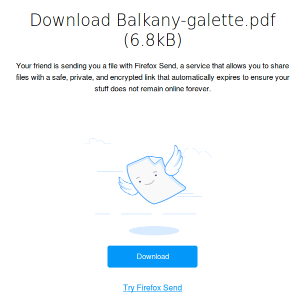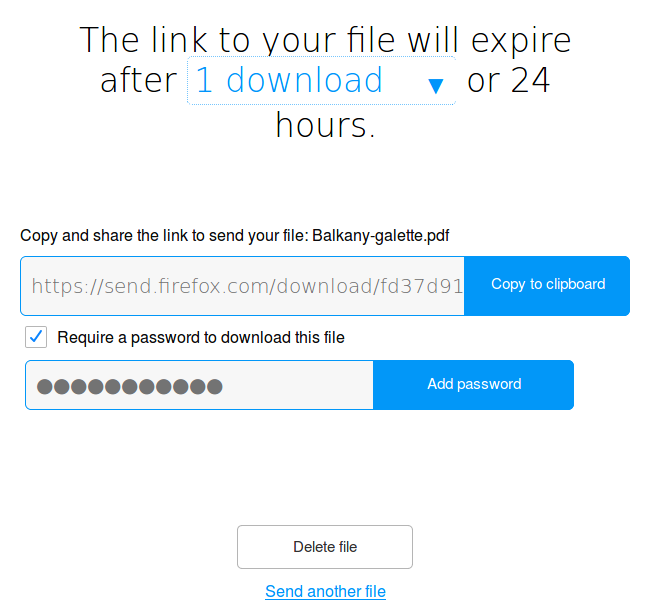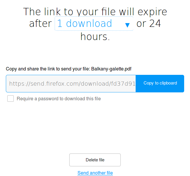 Votre fichier a été envoyer sur le site de façon sécurisé par defaut car votre navigateur utilise HTTPS, et mieux encore si vous utilisez TorBrower. Comme indiqué le site génère un lien UNIQUE et complexe qui vous faudra transmettre à votre interlocuteur. Le site n’autorise qu’un seul téléchargement et passé 24 heure le fichier disparaît. Si par exemple regarde votre historique de navigation et clique sur le lien, hop il n’y aura plus rien !