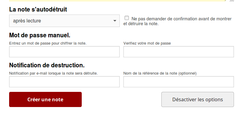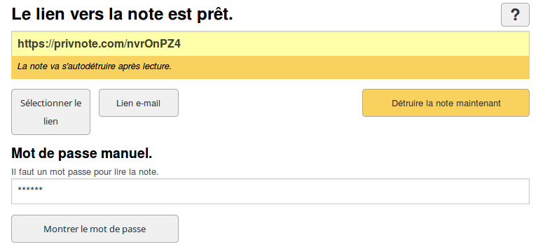 Il ne vous reste qu’a transmettre le lien en jaune à votre contact et voilà, seul lui pourra le lire et ensuite pouffff plus rien. Ca ne laisse aucune trace sauf éventuellement dans l’historique de votre navigateur comme quoi vous avez été sur privnote mais comme vous êtes malin vous avez ÉVIDEMENT ouvert une fenêtre de navigation privé dans votre navigateur préféré qui ne laisse pas d’historique hein 🙂