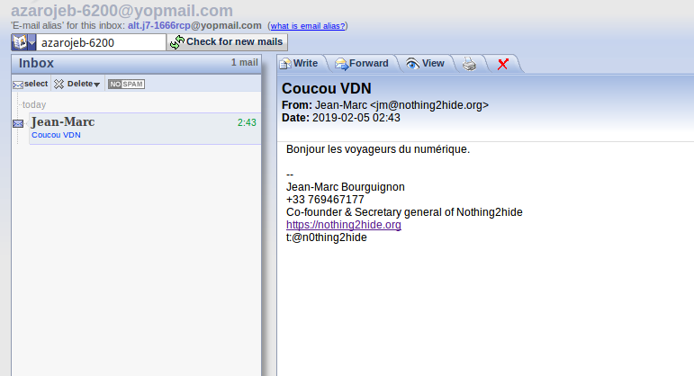 Hop une adresse mail fonctionnelle en 5 secondes, vous pouvez revenir dessus quand vous le voulez en tapant : azarojeb-6200 dans le champ à gauche de Check for new mails (Vous pouvez vous y rendre maintenant mais hey j’ai effacé mon mail hein ). Ce genre de service n’est pas « top sécurisé » mais peut rendre service, à vous d’être imaginatif.ve 🙂