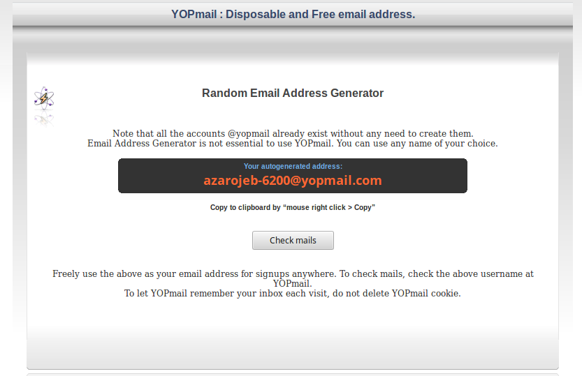 Page d’accueil on ne peut plus clair, dès l’ouverture YopMail vous génère une adresse email aléatoir