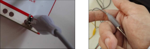 Il faut que vous expliquiez à vos participant.e.s de systématiquement brancher une pince crocodile sur deux des trous sur la partie inférieure du Makey-Makey. Ensuite quand ils veulent se servir du Makey-Makey, ielles doivent tenir dans leur main l’autre extrémité du câble. Cela revient à fermer le circuit électrique, le courant part de l’ordi, passe par le Makey-Makey, puis dans les objets que l’on relie. Quand on touche l’objet, on ferme le circuit puisque l’électricité passe dans notre corps et ressort via l’autre câble dans notre autre main.