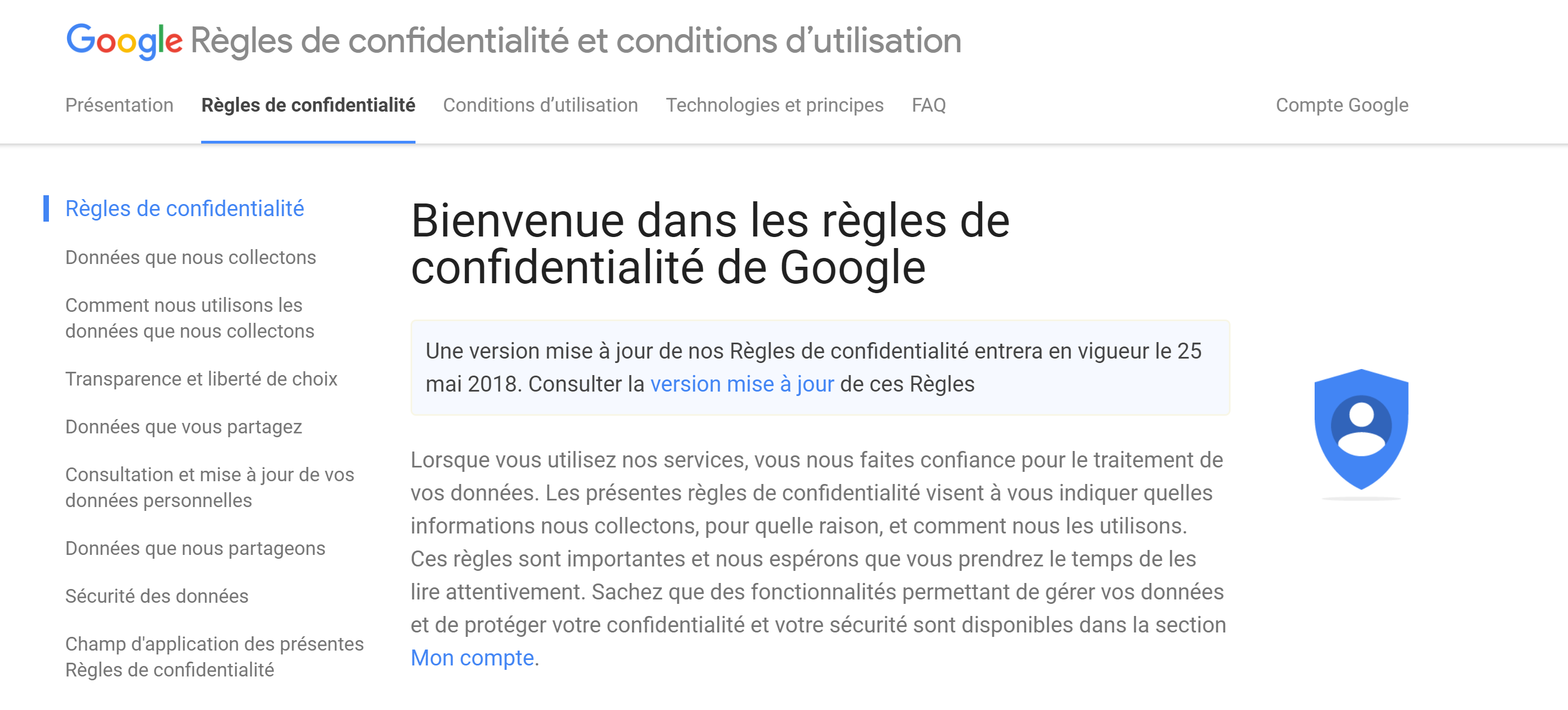 Tous les sites doivent par ailleurs donner un accès à leur politique de confidentialité (voir en annexe l’exemple de celles de Google)