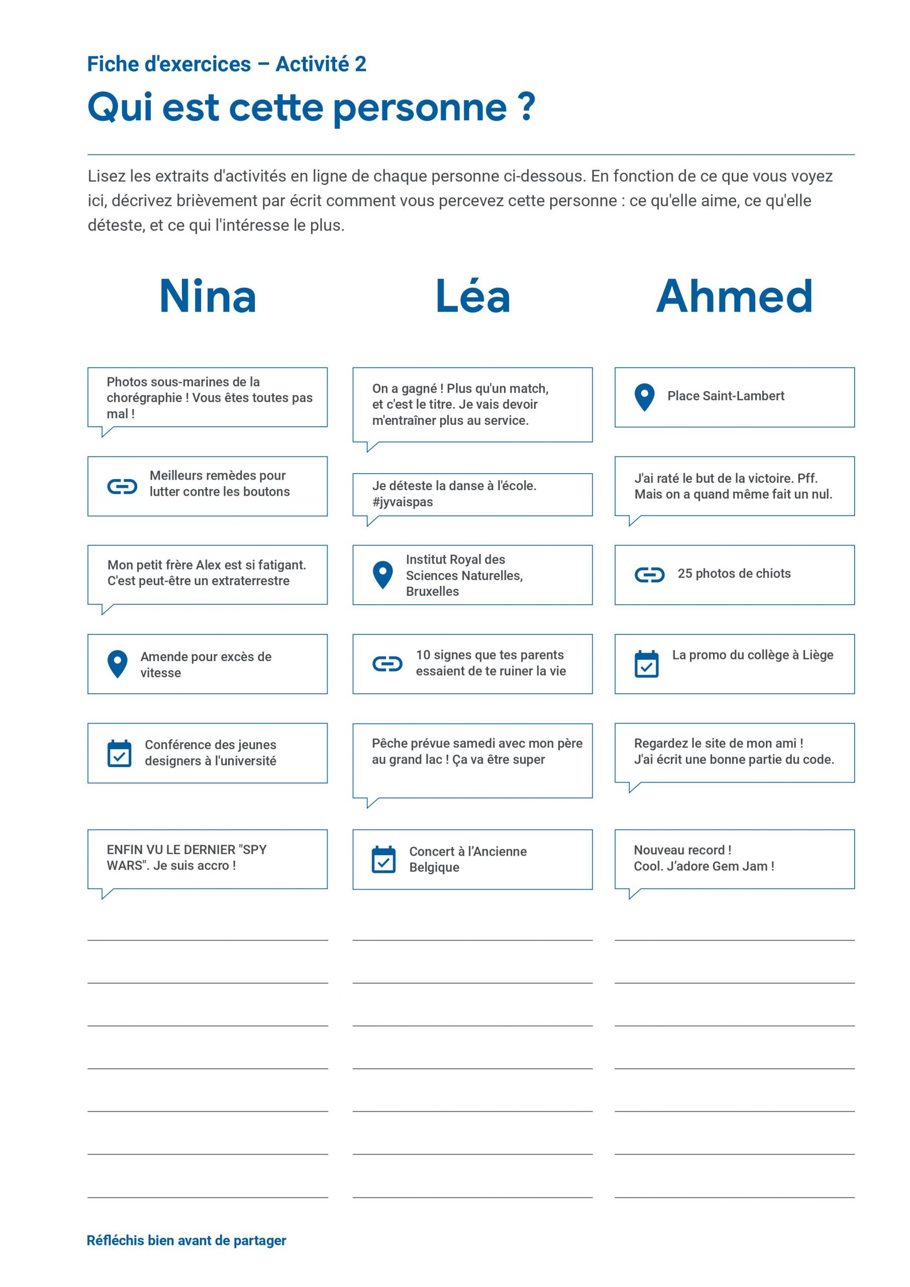 Une fois que tous les groupes ont terminé leur description, il faut dévoiler la vérité au sujet des trois personnes. Pour l’exemple montré en photo, voici les vraies personnalités de Nina, Léa et Ahmed: