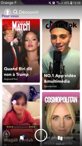 - Ielles peuvent également repérer ce qui est propre à Snapchat. C’est un peu touffu, un peu brouillon, et très flashy. Cela a pour but d’attirer les jeunes à consommer de l’information différemment, c’est-à-dire vite, avec l’essence de l’info mais pas de style ni de superflu, en cliquant un peu où bon leur semble, où leur envie les mène.