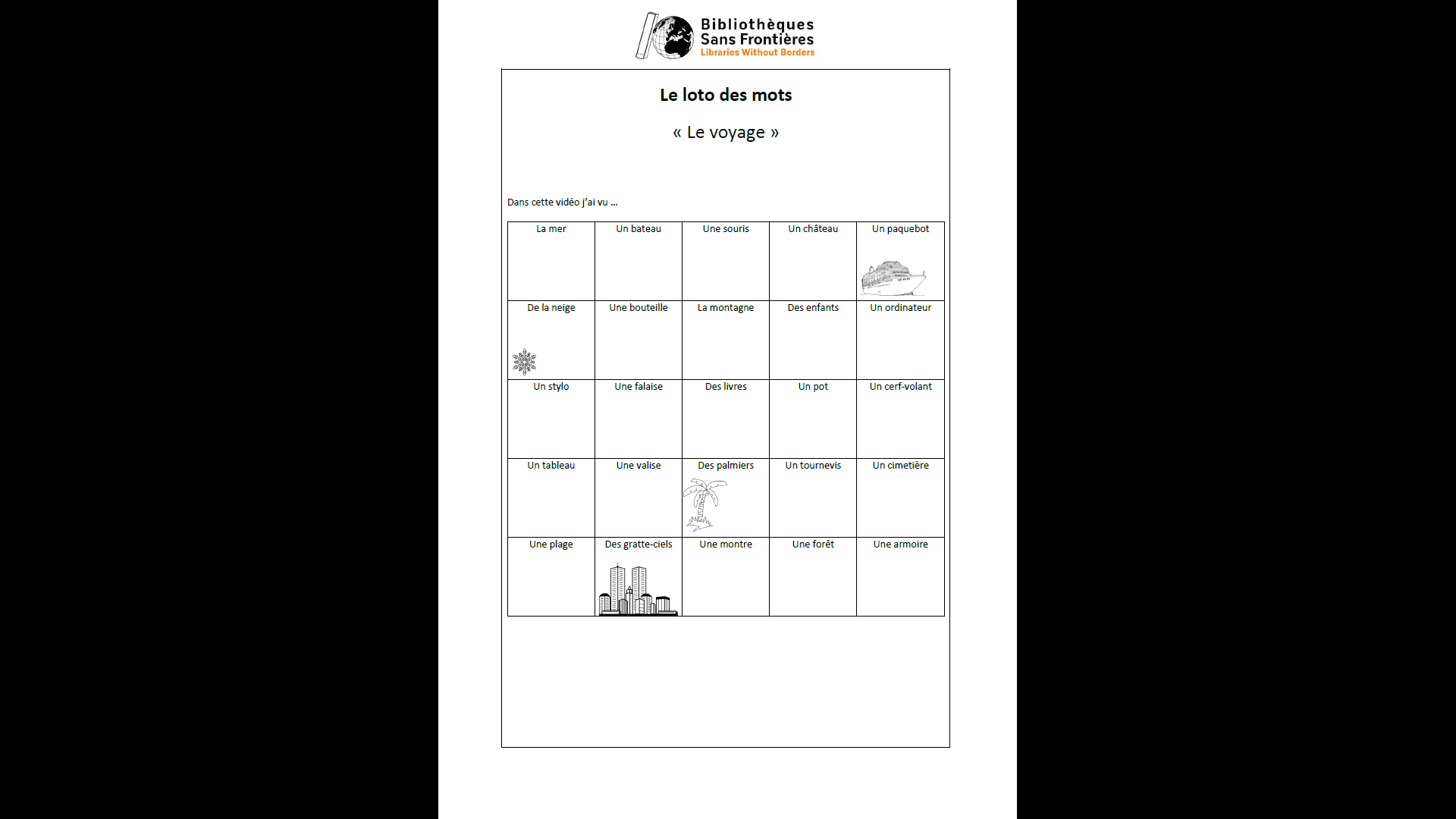 À chaque fois qu’ils reconnaissent dans la vidéo un des éléments de la grille du loto, ils le barrent. Tous les éléments ne sont pas à cocher. L’intérêt de l’activité est de travailler la correspondance entre image et écrit.
