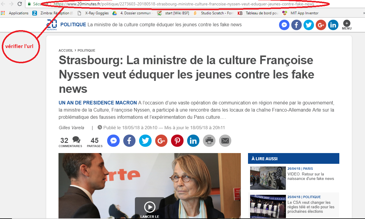 Ce qui est entouré en rouge c’est l’url de l’information qui faut vérifier en utilisant des sites qui vérifient la véracité d’une info.