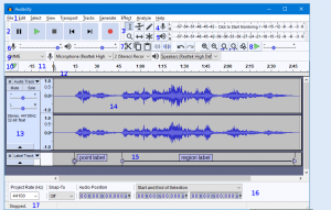 Voici un panorama plus général des fonctionnalités d’Audacity. Pas besoin de les maîtriser toutes dès la première fois, c’est en créant des projets différents que vous deviendrez un.e utilisateur.ice confirmé.e. Ceci n’est qu’un pense-bête, de quoi se faire une idée des possibilités qu’offre le logiciel. Les fonctionnalités sont numérotés de 1 à 17, dont certaines que vous connaissez déjà grâce aux étapes précédentes.