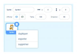 En effectuant un clic droit sur l’icône représentant le lutin, un menu déroulant s’ouvre. Vous pourrez alors dupliquer, exporter ou supprimer votre lutin.