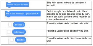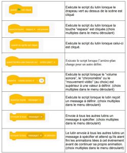 Les blocs événements définissent l’action qui déclenchera l’animation des lutins. Cette action peut être différente pour chaque lutin.