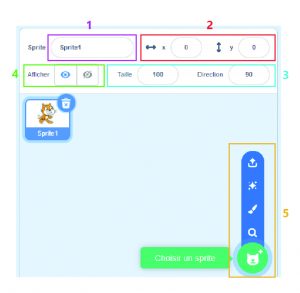 2 : modifier l’emplacement du lutin sur la scène en modifiant les abscisses et les ordonnées (vous pouvez également le faire en déplacement le lutin directement sur la scène à l’aide de votre souris).