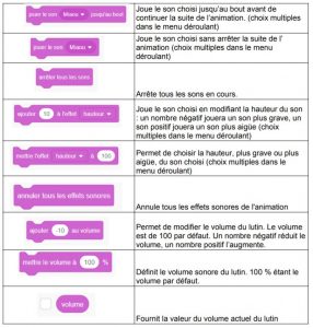- Le bloc « volume sonore » : l’utilisation de ce bloc nécessite un ordinateur équipé d’un microphone. Il permet de détecter le son capté par celui-ci. En cela, il est différent du bloc « volume » qui fournit la valeur du son du lutin