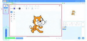 Le logiciel scratch choisit d’office un arrière plan blanc, mais il est possible de changer celui-ci en allant piocher dans la bibliothèque de Scratch, de le dessiner ou de l’importer depuis son ordinateur.