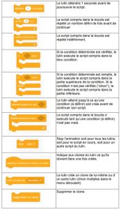Pour le bloc « envoyer à tous et attendre » : définir un message permet de synchroniser les éléments (lutins et/ou arrière-plans) entre eux. Par exemple, un premier lutin peut, au cours de son animation, envoyer un message à un second lutin qui ne commencera son animation que lorsqu’il aura reçu ce message. Si on commande au premier lutin d’“envoyer à tous message1”, il enverra son message tout en continuant son animation jusqu’au bout. En revanche, si on commande au premier lutin d’“envoyer à tous message1 et attendre”, il enverra son message et attendra que le second lutin finisse l’animation liée au message avant de continuer la sienne.