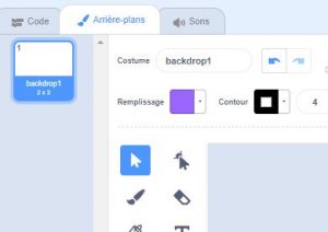 De la même manière que pour les lutins, il est possible d’avoir plusieurs arrière plans afin de créer des effets d’animation. Dans la vignette qui apparaît en bas à droite de l’écran vous ne verrez en revanche, que l’arrière plan qui est actuellement visible dans votre scène. Pour voir l’ensemble de votre arrière plan et en ajouter de nouveaux, il faut vous rendre dans l’onglet « arrière plan » (en haut à gauche de l’écran). Dans cet onglet, comme pour celui des « costumes » (voir les détails plus haut), vous pourrez modifier votre arrière plan et en ajouter des nouveaux.