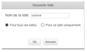 Une liste est une structure de données permettant de regrouper, d’organiser et de traiter des informations plus simplement. Par exemple, il est possible de créer une liste de mots que mon lutin affichera de manière aléatoire.Pour créer une nouvelle liste, il suffit de cliquer sur “créer une liste”. On peut ensuite paramétrer la liste “pour tous les lutins”, ce qui signifie qu’elle s’appliquera à tous les lutins créés. Ou bien on peut paramétrer la liste “pour ce lutin uniquement”, ce qui signifie qu’elle s’appliquera seulement au lutin sélectionné. Pour l’exemple, nous créerons une liste de course.