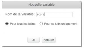 Nous appellerons, pour l’exemple, notre variable “score”. Il faut ensuite décider si cette variable ne s’appliquera qu’à ce seul lutin ou bien également à tous les autres. Si elle ne s’applique qu’au seul lutin sélectionné, alors elle fonctionne indépendamment des autres lutins créés. Si elle s’applique à tous les lutins, alors elle peut varier en fonction des actions de chacun des lutins créés. Toutefois, si vous décidez en cours de route de modifier cette variable pour un seul lutin, cela ne fonctionnera pas.