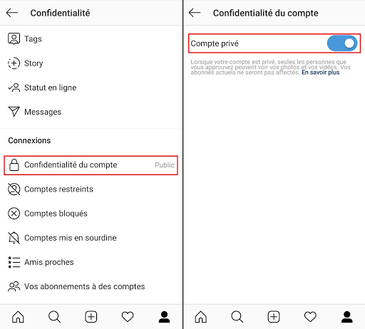 Il est possible de protéger vos informations sur instagram en modifiant les paramètres de confidentialité pour que votre compte soit privé, ainsi vos publications ne seront visibles que par vos abonnés. Pour ce faire, il suffit d’ouvrir les paramètres > confidentialité du compte > compte privé.