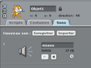 Pour jouer un son, il faut d’abord aller dans l’onglet son de l’objet et importer (ou enregistrer) un son.