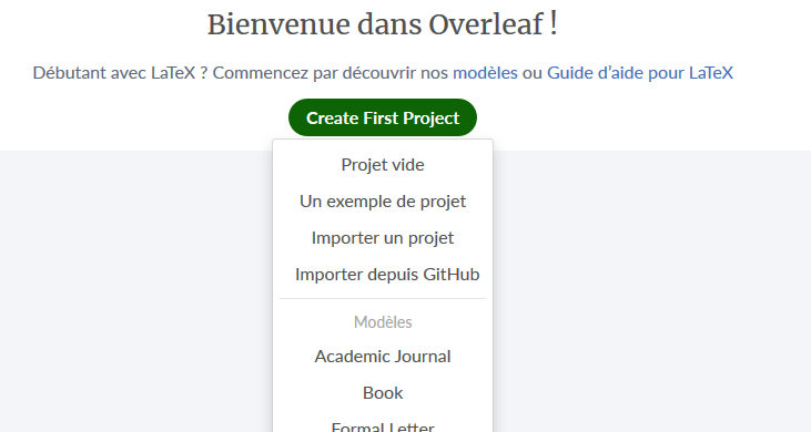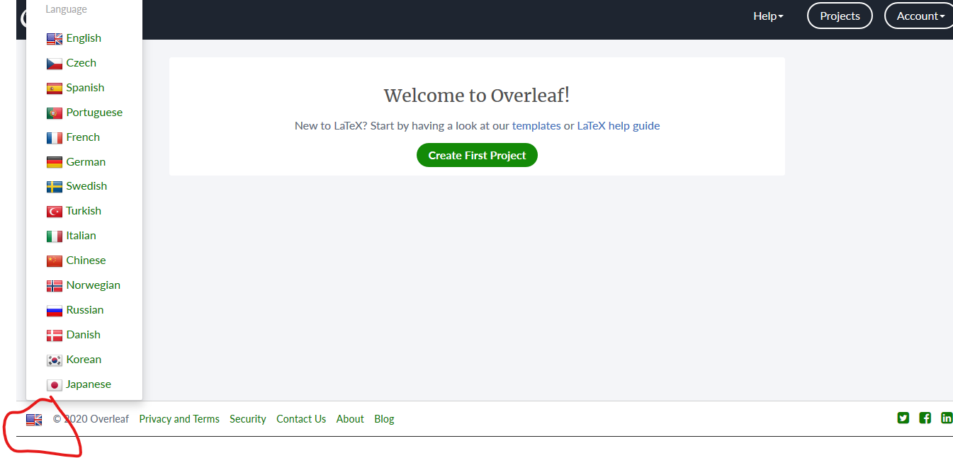 Rendez-vous sur Overleaf .Il est possible que la page qui s’ouvre soit en anglais. Pour changer langue, cliquez sur le drapeau en bas à gauche de la page et choisissez celui correspondant à la langue de votre préférence.