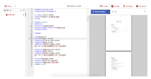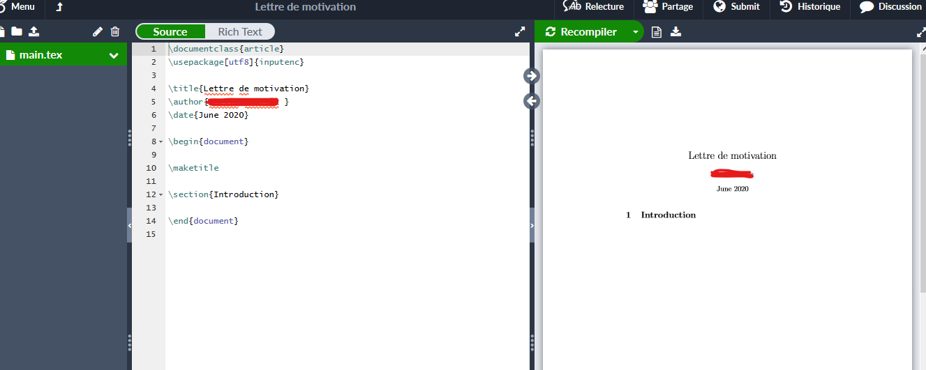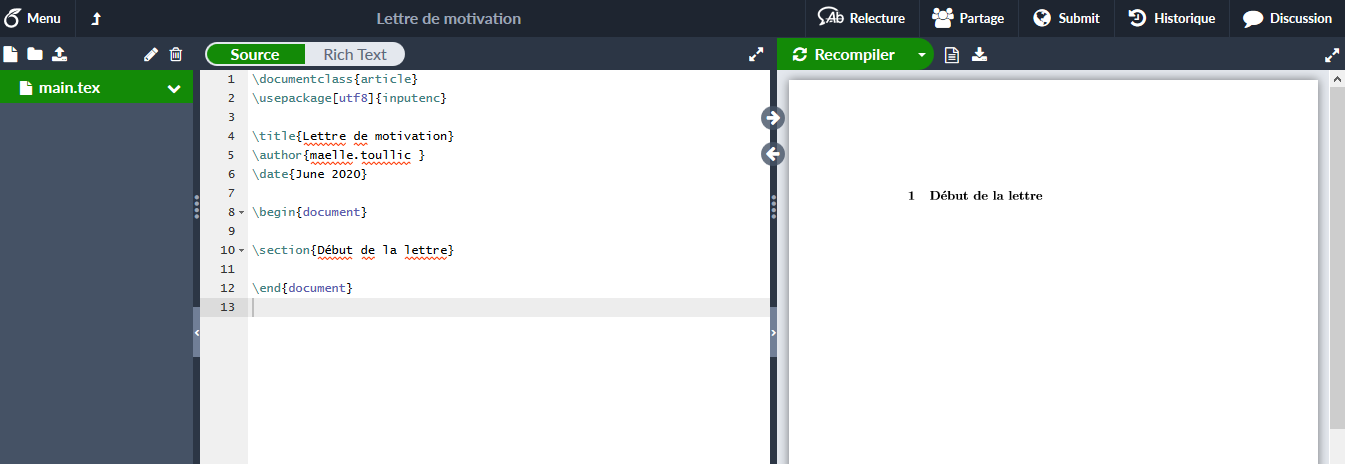Le bouton Recompiler sert à traduire votre document en document « visuel » : par défaut, la compilation du document doit se faire en cliquant sur le bouton. Cela vous permet de voir visuellement votre mise en page uniquement lorsque vous le désirez. Vous avez aussi la possibilité, en cliquant sur la flèche déroulante à côté du bouton, d’activer la compilation automatique : la compilation se fera pendant votre écriture, au fur et à mesure. Vous pouvez constater que votre document n’est en réalité pas totalement vierge par défaut. De base sont indiqué :