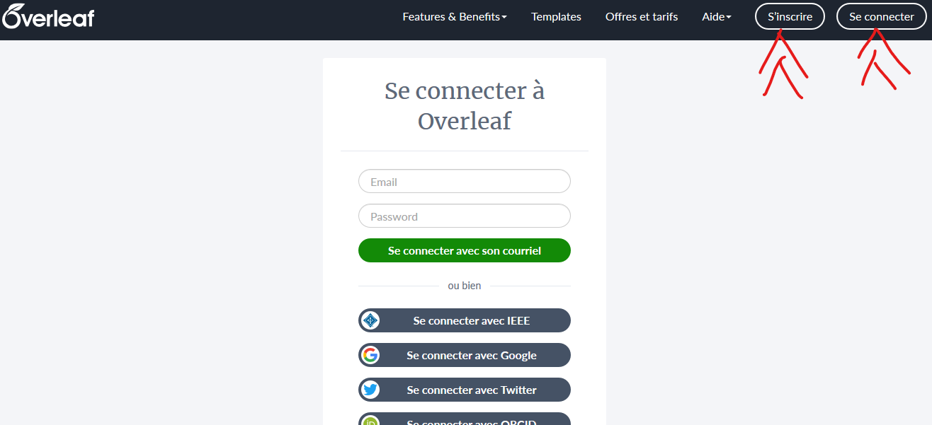 Connectez-vous à votre compte Overleaf en cliquant sur « Se connecter ». Si vous n’avez de compte, créez en un en cliquant sur « S’inscrire ».