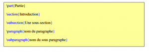 Dans cet exemple, l’image sera alignée à droite du texte et à une distance 0.1du texte.L’image aura une largeur de 2 cm. Nous avons rajouté l’option d’un titre à l’image avec la commande caption{}Les sections Dans un document LateX, vous avez la possibilité d’ajouter des chapitres, des sections ou des sous-sections afin de structurer votre document. Néanmoins, pour cela, il faut que vous ayez défini au préalable le type de document correspondant dans le préambule du code car tous les documents ne peuvent pas recevoir ce type de découpage (par exemple, un article ne pourra pas faire l’objet d’un découpage en chapitres). Si vous n’avez pas défini au préalable le bon type de document, ou que vous changer d’avis en cours d’écriture, pas de panique, il vous suffit de retourner au préambule du document et de changer la section documentclass{} . Saisissez entre les accolades le nouveau type de document que vous souhaitez travailler.
