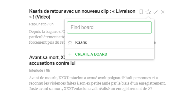 Prenons l’exemple du rap français. Vous vous passionnez ou vous faites une étude sur le rap en France (son état, etc). Créez vous des fils d’informations (catégorie « Feed ») et des tableaux (catégorie « board »).