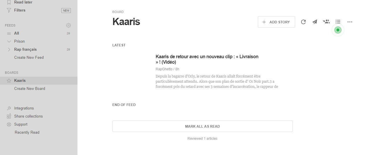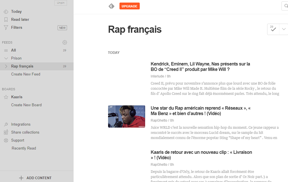 Dans la catégorie « Feed » une catégorie rap français a été crée et dans un même temps des sources suivies/choisies. Aller dans cette catégorie.Un certain nombre de contenu qui s’y est automatiquement référencé. Ce sont les nouveaux contenus des sources suivies. Pour chaque contenu, il est possible de décider de le supprimer, lui mettre une petite étiquette signifiant « à lire plus tard », une étiquette « déjà lu », ou alors de le placer dans un tableau.