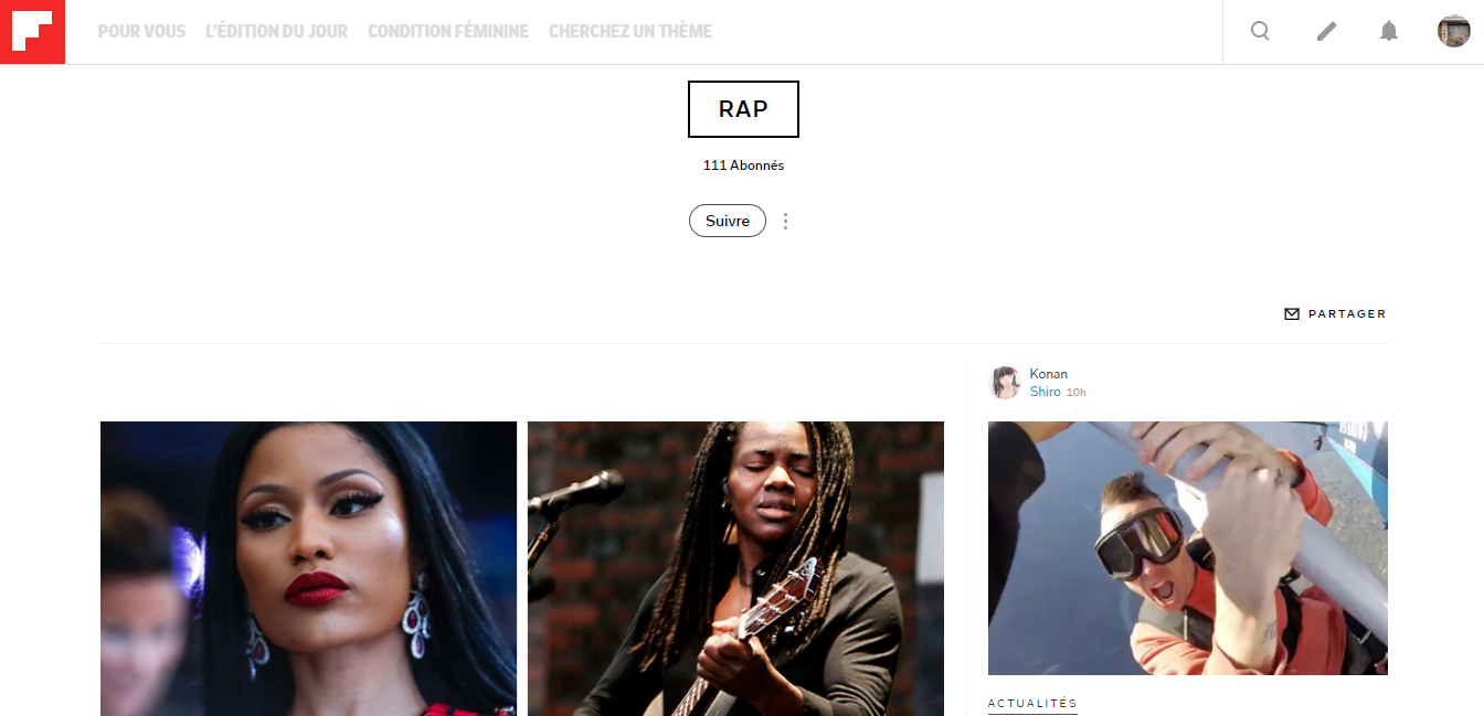 Flipboard vous permet deux choses. Vous pouvez faire des veilles d’informations assez générales, où en choisissant certaines catégories de sujets qui vous intéressent (condition féminine, écologie, etc) vous aurez automatiquement, sur votre page d’accueil, un fil des nouvelles actualités en rapport avec ces thèmes. Les contenus qui s’affichent sont des contenus déjà enregistrés dans les « magazines » créés par d’autres utilisateurs.