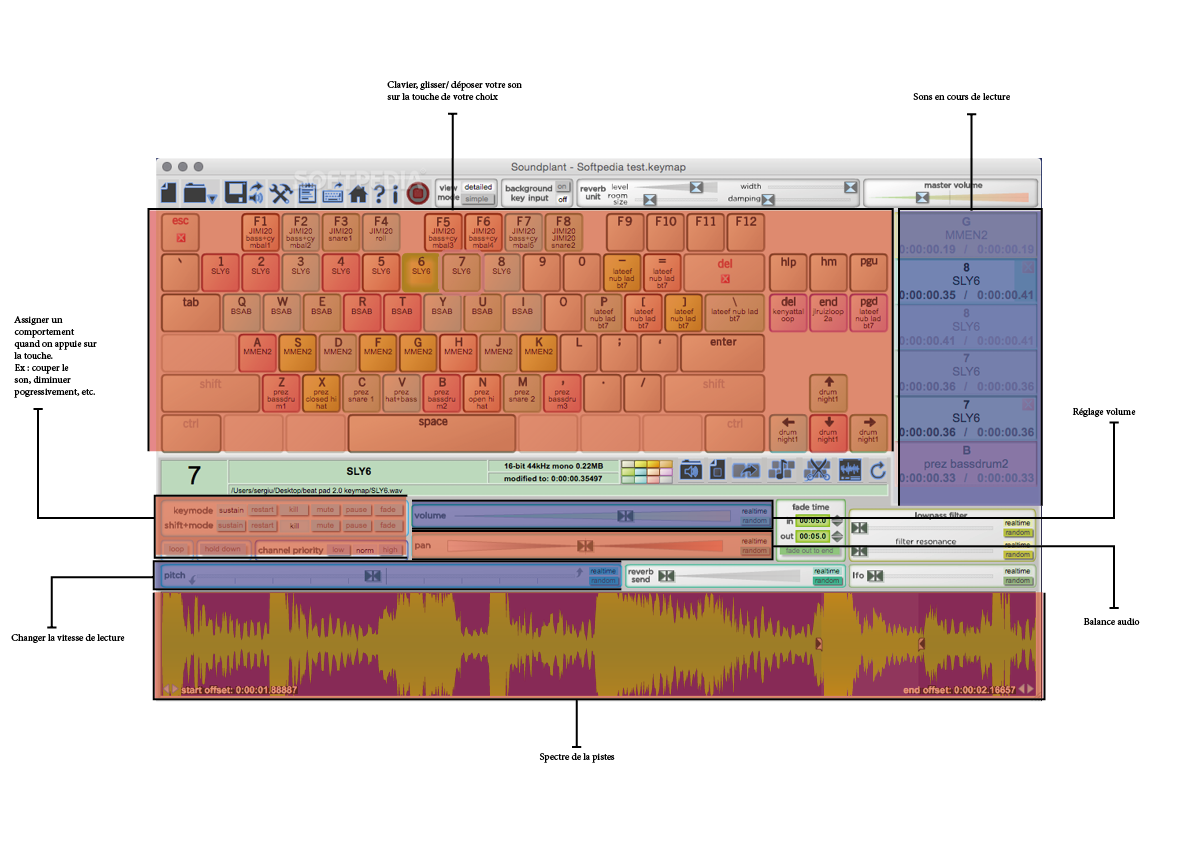 – Glisser/déposer : pour assigner un son à une touche du clavier, il suffit de faire un glisser/déposer du fichier sur la touche correspondante. Pour la version gratuite, il est possible de charger et de lancer jusqu’à 25 échantillons.