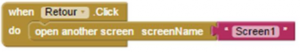 Le code est très simple: quand on clique sur le bouton retour, on retourne à l’écran dont le nom est “Screen1”.
