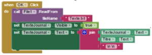 Quand le “Ok” est pressé, on va regarder s’il y a déjà un texte enregistré dans un fichier “Texte.txt”. Si c’est le cas, on l’ajoutera dans un deuxième temps, sinon on colle juste le texte qui existe déjà dans la zone de texte et l’on rajoute notre nouveau titre. Puis on saute deux lignes (en utilisant n qui saute une ligne automatiquement).