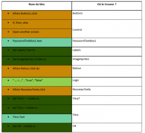 Nous allons maintenant programmer l’application. Si vous ne trouvez pas un des blocs utiles, n’hésitez pas à consulter l’annexe. Allez dans la partie Blocks.