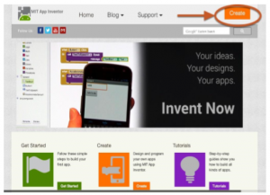 Allez sur le site http://appinventor.mit.edu/ et cliquez sur le bouton “Create”.