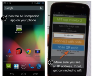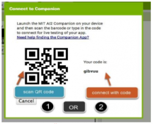 Attention : Votre téléphone /tablette doit être connecté au même réseau wifi que votre ordinateur pour que l’application fonctionne, si vous ne pouvez pas vous connecter au wifi, allez dans la partie instruction du site App Inventor et cherchez « How To connect with a USB cable »