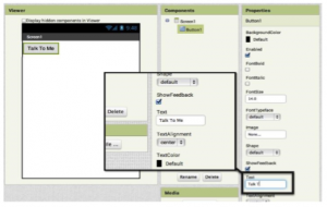 Dans la partie « Properties », aller sur la zone de saisie « Text » et remplacer « Text for Button1 » par « Talk To Me »