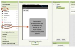 Allez dans la partie « Média » de la « Palette » et faites glisser l’élément Text To Speech dans votre application. C’est un élément non visible : il n’apparaît pas dans l’interface utilisateur
