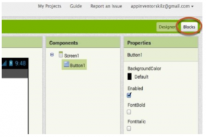 Il est temps de dire à votre application quoi faire. Cliquer sur le bouton « Blocks » pour passer dans la partie édition. Voyez les boutons « Designer » et « Blocks » comme des onglets entre lesquels on peut naviguer pour s’occuper de la partie graphique et de la partie programmation.