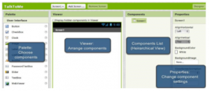 La partie “Designer” est l’endroit où vous pouvez définir l’apparence de votre application ainsi que les fonctionnalités dont elle dispose. Vous choisissez les éléments pour l’interface utilisateur comme dès les boutons, les images, zone de texte mais également les fonctionnalités comme le Text-toSpeech, les senseurs (sensors) ou encore le GPS :