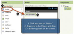 Notre projet nécessite un bouton et pour cela, il faut cliquer sur le mot « Button » dans la palette et rester appuyé tout en glissant vers la zone centrale « Viewer », lorsque vous y êtes, relâchez le bouton et votre bouton devrait apparaître dans la zone de rendu :