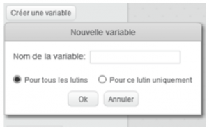 - Maintenant, nous allons créer une variable score. Une variable est une « boîte » dans laquelle il est possible de ranger des informations, ici le score. Pour cela allez dans « Données », « Créer une variable » et appelez la « score ». Elle s’applique à tous les lutins.