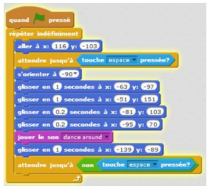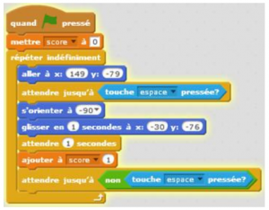 - Enfin, il ne reste plus qu’à insérer le script suivant dans le code du petit chat. Quand la partie se lance, on attend jusqu’à ce que la touche espace soit pressée. Si c’est le cas, le chat avance vers le panier et le score augmente. Quand la touche espace est relâchée, le chat retourne à sa position initiale. Le « attendre une seconde » permet d’éviter en partie certains bugs (faux contact).