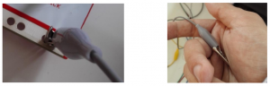 Il faut que vous expliquiez à vos participants de systématiquement brancher une pince crocodile sur deux des trous sur la partie inférieure du Makey-Makey. Ensuite quand ils veulent se servir du Makey-Makey, ils doivent tenir dans leur main l’autre extrémité du câble. Cela revient à fermer le circuit électrique, le courant part de l’ordi, passe par le Makey-Makey, puis dans les objets que l’on relie. Quand on touche l’objet, on ferme le circuit puisque l’électricité passe dans notre corps et ressort via l’autre câble dans notre autre main.