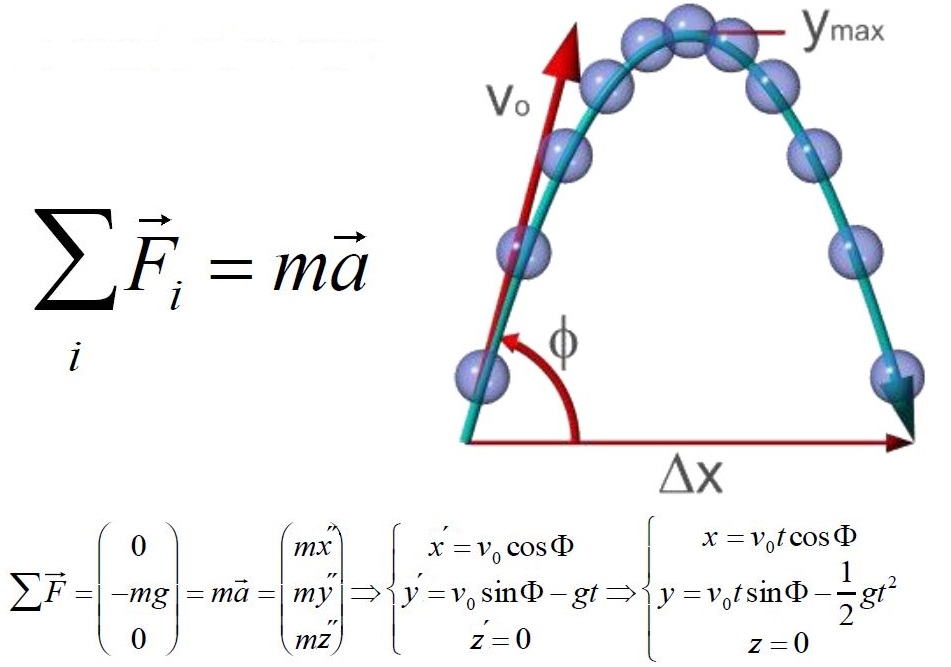 Le boulet de canon est tiré avec une vitesse v0 un angle initial de tir Φ, sa trajectoire si la seule force à prendre en compte est la gravité est une parabole. On va calculer les coordonnées successives du boulet avec un procédé simple d’intégration numérique.