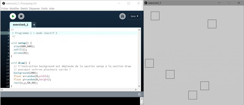 - L’instruction background est déplacée de la fonction setup() à la fonction draw(), l’écran est donc effacé à chaque nouveau carré, on devrait alors ne voir qu’un seul carré à l’écran à la fois, pourquoi en voit-on plusieurs ?