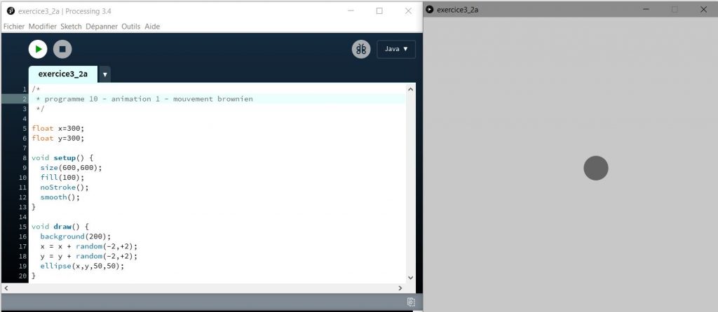 Dans le programme précédent le placement du rectangle est aléatoire. Il est donc incohérent s’il s’agit d’illustrer comment réaliser une animation. Dans ce programme un cercle va être déplacé depuis sa position initiale en suivant un trajet aléatoire (mouvement brownien). Le mouvement est rendu cohérent du fait que chaque position est définie non par rapport au plan entier de l’écran mais par un léger déplacement par rapport à la position précédente du cercle.