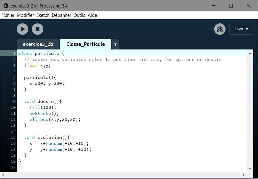 class Particule { float x,y; Particule(){ x=300; y=300; } void dessin(){ fill(100); noStroke(); ellipse(x,y,20,20); } void evolution(){ x = x+random(-10,+10); y = y+random(-10, +10); } }