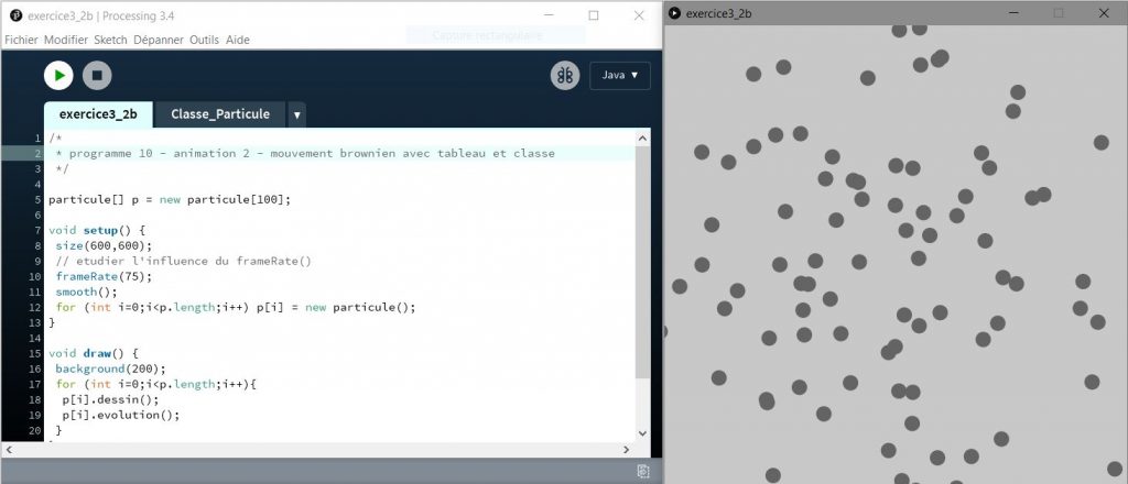 Notez que dans cet exemple, le mouvement des points n’est pas confiné, ils peuvent sortir de l’écran. De plus les collisions entre point ne sont pas gérées, à vous de compléter le programme !
