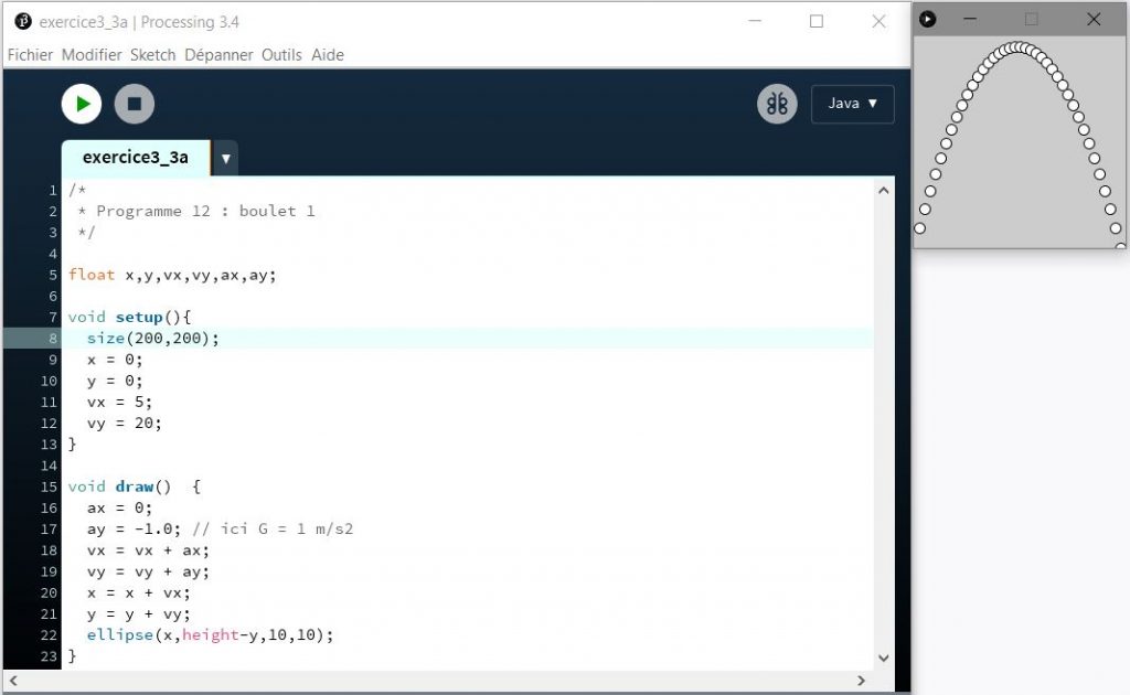 /* * Programme 11 : boulet 1 */ float x,y,vx,vy,ax,ay; void setup(){ size(200,200); x = 0; y = 0; vx = 5; vy = 20; } void draw() { ax = 0; ay = -1.0; // ici G = 1 m/s2 vx = vx + ax; vy = vy + ay; x = x + vx; y = y + vy; ellipse(x,height-y,10,10); }
